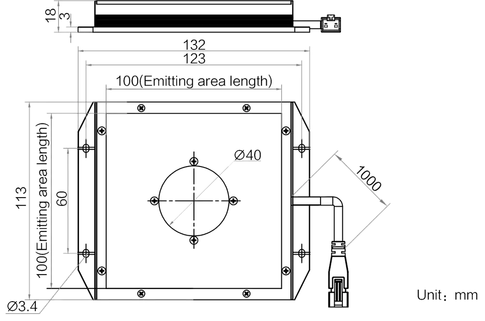 Mechanische Spezifikationen des MV-LBES-H-100-100-W2: Abmessungen: 132 mm × 113 mm × 18 mm | Bohrungsdurchmesser: Ø 40 mm | Abstrahlflächenabmessungen: 100 mm × 100 mm | Gewicht: 0.3 kg. Diffusionsplatte (Included) inklusive für gleichmäßigere Lichtverteilung.