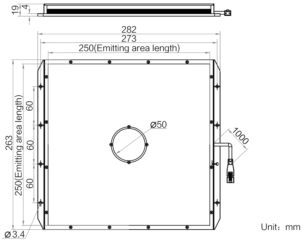 Mechanische Spezifikationen des MV-LBES-H-250-250-R2: Abmessungen: 282 mm × 263 mm × 19 mm | Bohrungsdurchmesser: Ø 50 mm | Abstrahlflächenabmessungen: 250 mm × 250 mm | Gewicht: 1.1 kg. Diffusionsplatte (Included) inklusive für gleichmäßigere Lichtverteilung.