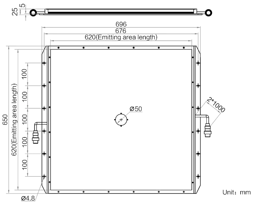 Mechanische Spezifikationen des MV-LBES-H-620-620-W: Abmessungen: 696 mm × 650 mm × 25 mm | Bohrungsdurchmesser: Φ50 mm | Abstrahlflächenabmessungen: 620 mm × 620 mm | Gewicht: 10 kg. Diffusionsplatte (Included) inklusive für gleichmäßigere Lichtverteilung.