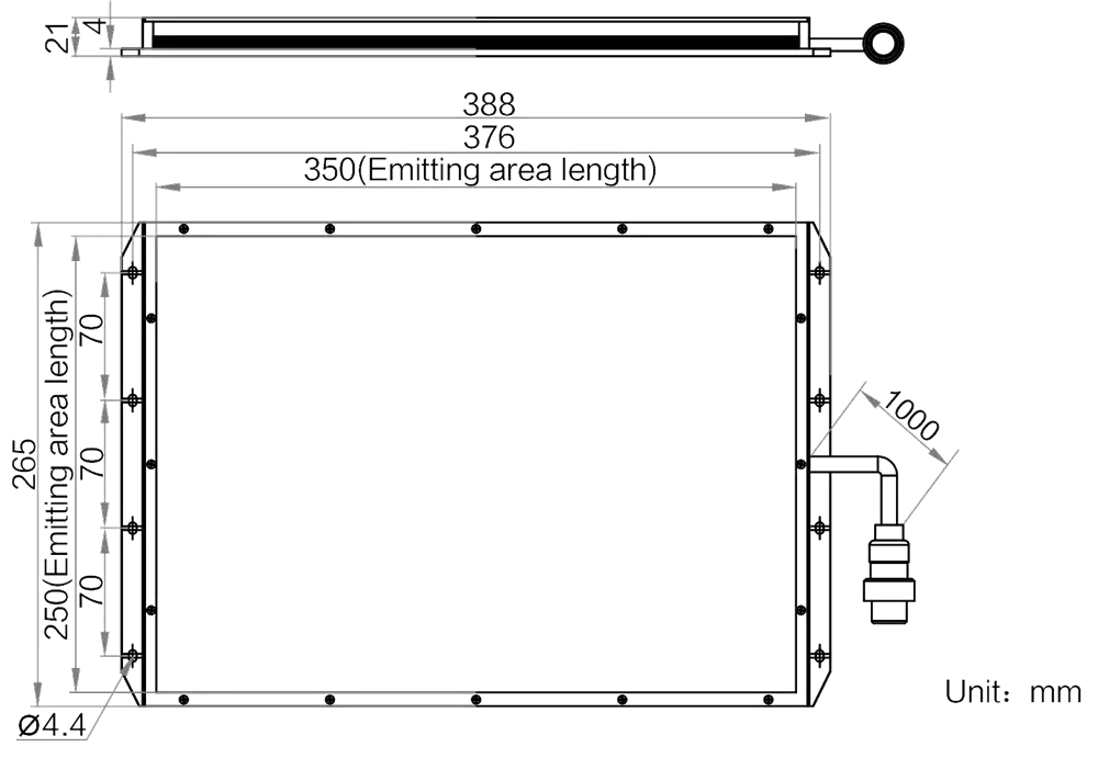 Mechanische Spezifikationen des MV-LBSS-H-350-250-B2: Abmessungen: 388 mm × 265 mm × 21 mm | Abstrahlflächenabmessungen: 350 mm × 250 mm | Gewicht: 2 kg. Diffusionsplatte (Included) inklusive für gleichmäßigere Lichtverteilung.