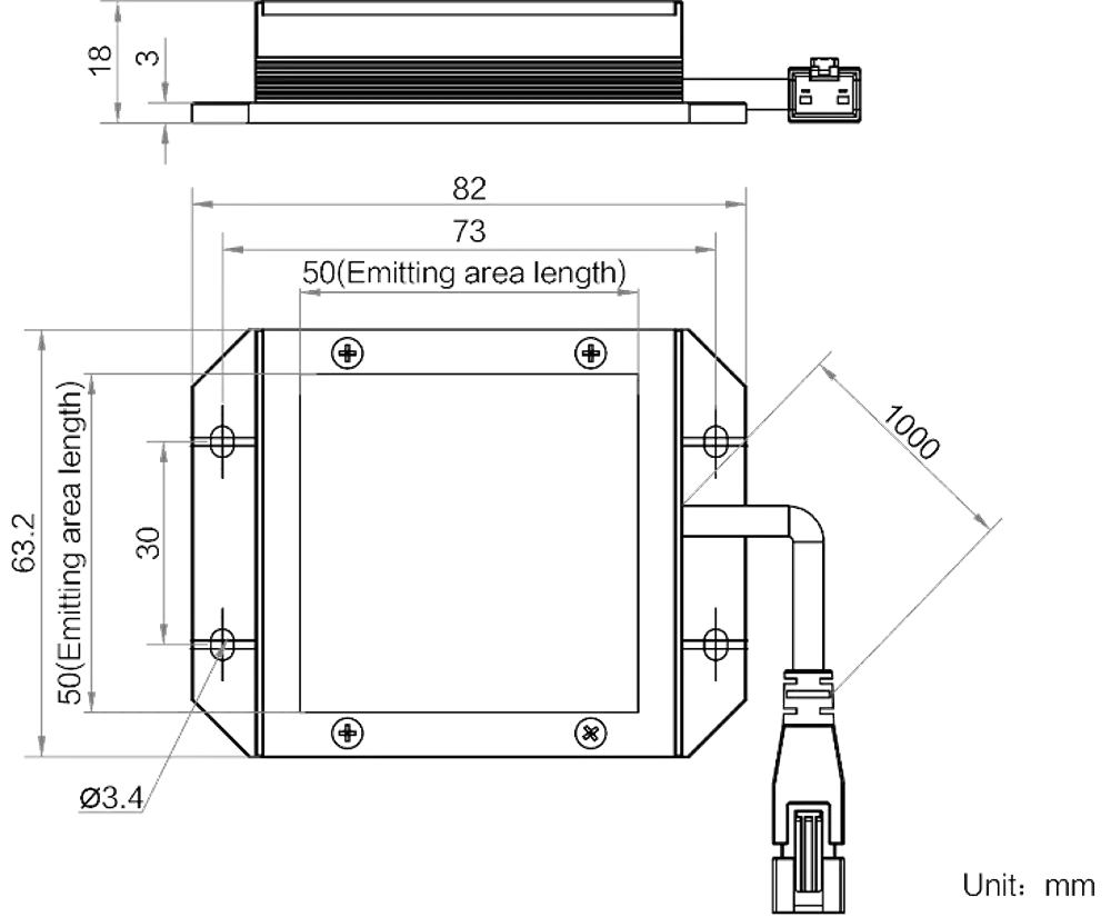 Mechanische Spezifikationen des MV-LBSS-H-50-50-B2: Abmessungen: 82 mm × 63.2 mm × 18 mm | Abstrahlflächenabmessungen: 50 mm × 50 mm | Gewicht: 0.15 kg. Diffusionsplatte (Included) inklusive für gleichmäßigere Lichtverteilung.