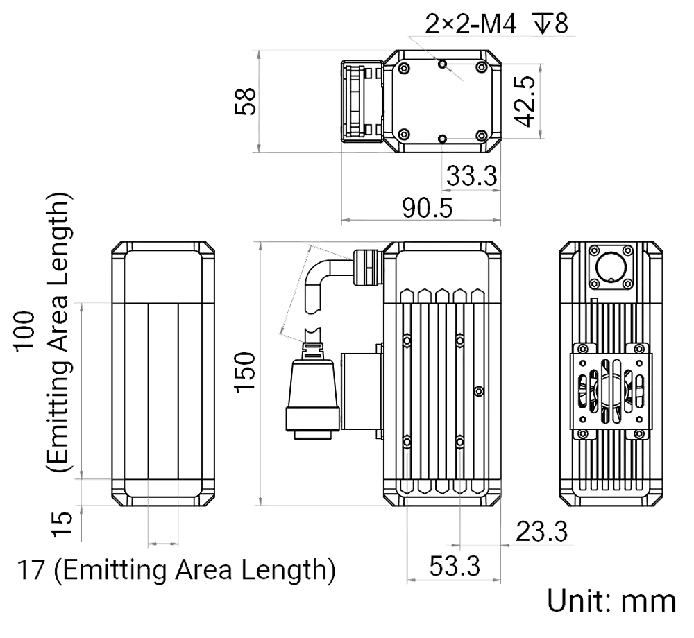Mechanische Spezifikationen des MV-LTDS-H-100-W: Abmessungen: 150 mm × 58 mm × 90.5 mm | Abstrahlflächenabmessungen: 100 mm × 17 mm | LED-Reihen: 1 | Gewicht: 1.09 kg.