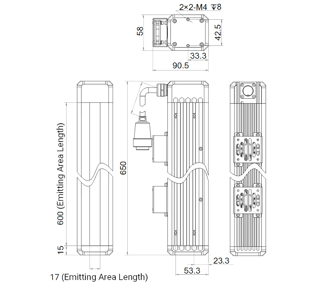 Mechanische Spezifikationen des MV-LTDS-H-600-W: Abmessungen: 650 mm × 58 mm × 90.5 mm | Abstrahlflächenabmessungen: 600 mm × 17 mm | LED-Reihen: 1 | Gewicht: 3.65 kg.