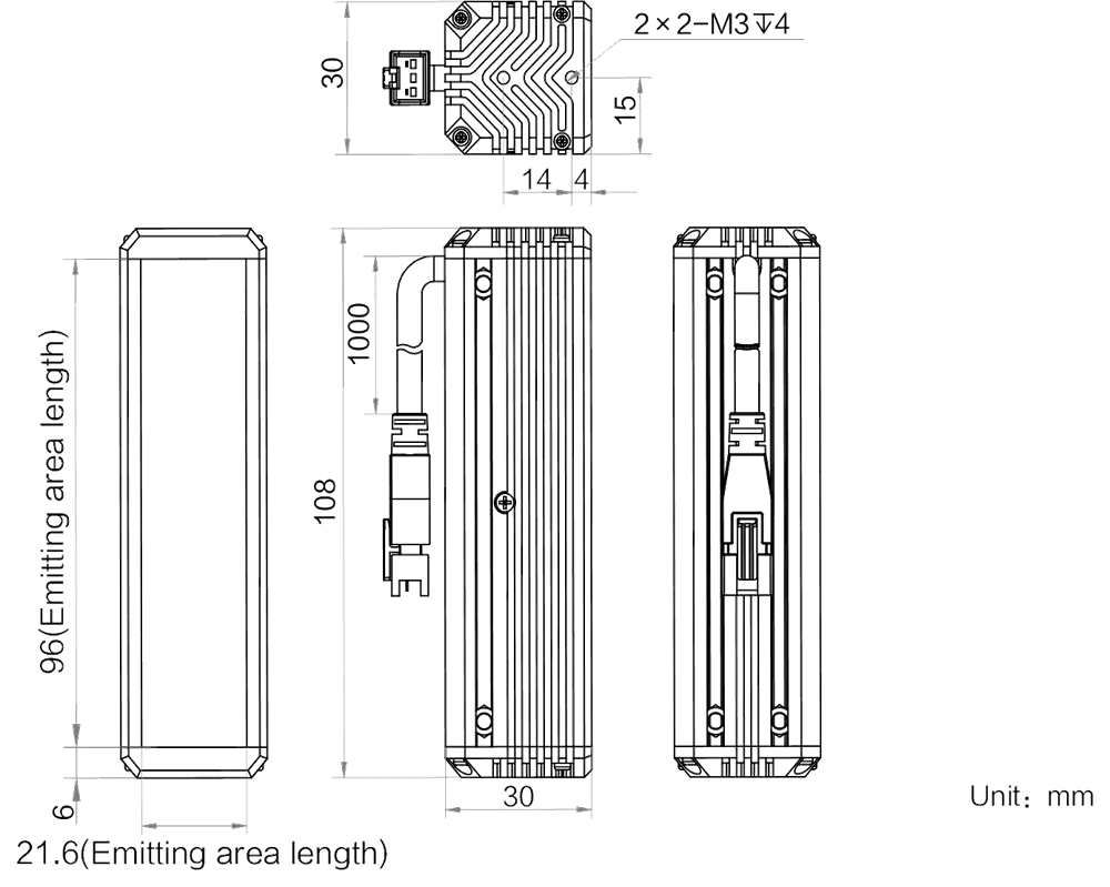 Mechanische Spezifikationen des MV-LLDS-H-100-30-IR850: Abmessungen: 108 mm × 30 mm × 30 mm | Abstrahlflächenabmessungen: 96 mm × 21.6 mm | LED-Reihen: 4 | Gewicht: 0.2 kg. Diffusionsplatte (PMMA) inklusive für gleichmäßigere Lichtverteilung. Die 4-reihige LED-Anordnung sorgt für besonders hohe und gleichmäßige Leuchtdichte über das gesamte Abstrahlfeld.
