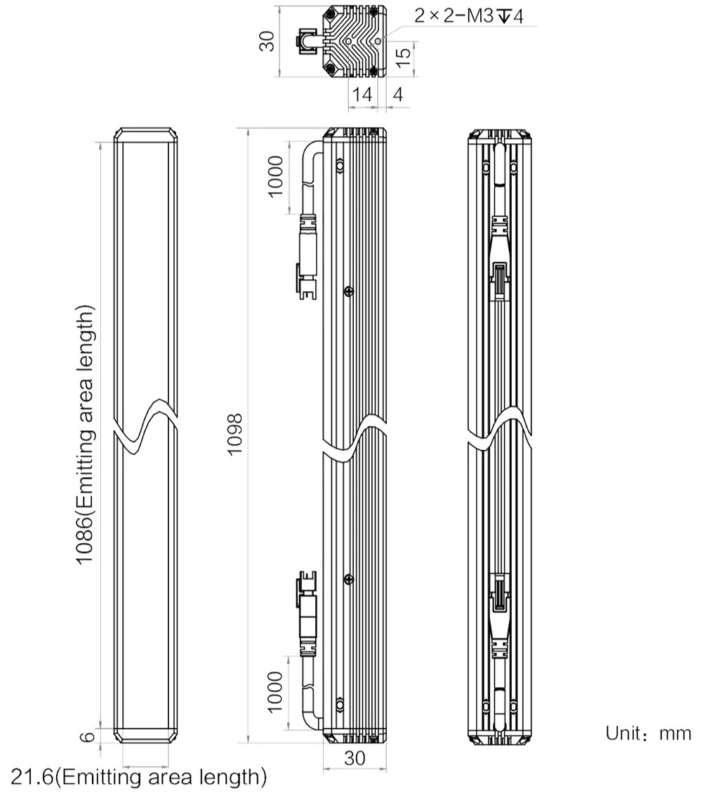 Mechanische Spezifikationen des MV-LLDS-H-1200-30-IR940: Abmessungen: 1098 mm × 30 mm × 30 mm | Abstrahlflächenabmessungen: 1086 mm × 21.6 mm | LED-Reihen: 4 | Gewicht: 1.92 kg. Diffusionsplatte (PMMA) inklusive für gleichmäßigere Lichtverteilung. Die 4-reihige LED-Anordnung sorgt für besonders hohe und gleichmäßige Leuchtdichte über das gesamte Abstrahlfeld.