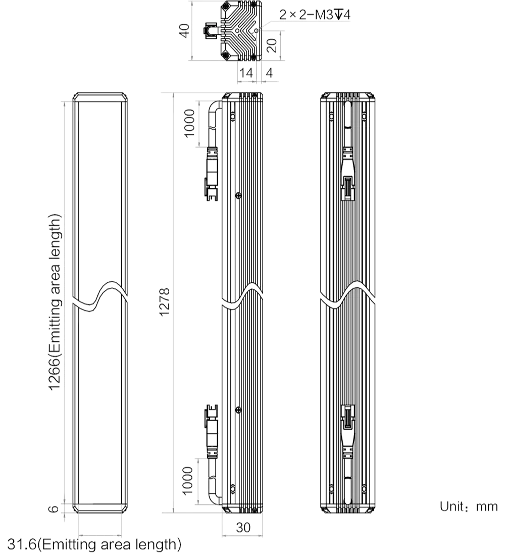 Mechanische Spezifikationen des MV-LLDS-H-1400-40-W: Abmessungen: 1278 mm × 40 mm × 30 mm | Abstrahlflächenabmessungen: 1266 mm × 31.6 mm | LED-Reihen: 6 | Gewicht: 2.45 kg. Diffusionsplatte (PMMA) inklusive für gleichmäßigere Lichtverteilung. Die 6-reihige LED-Anordnung sorgt für besonders hohe und gleichmäßige Leuchtdichte über das gesamte Abstrahlfeld.