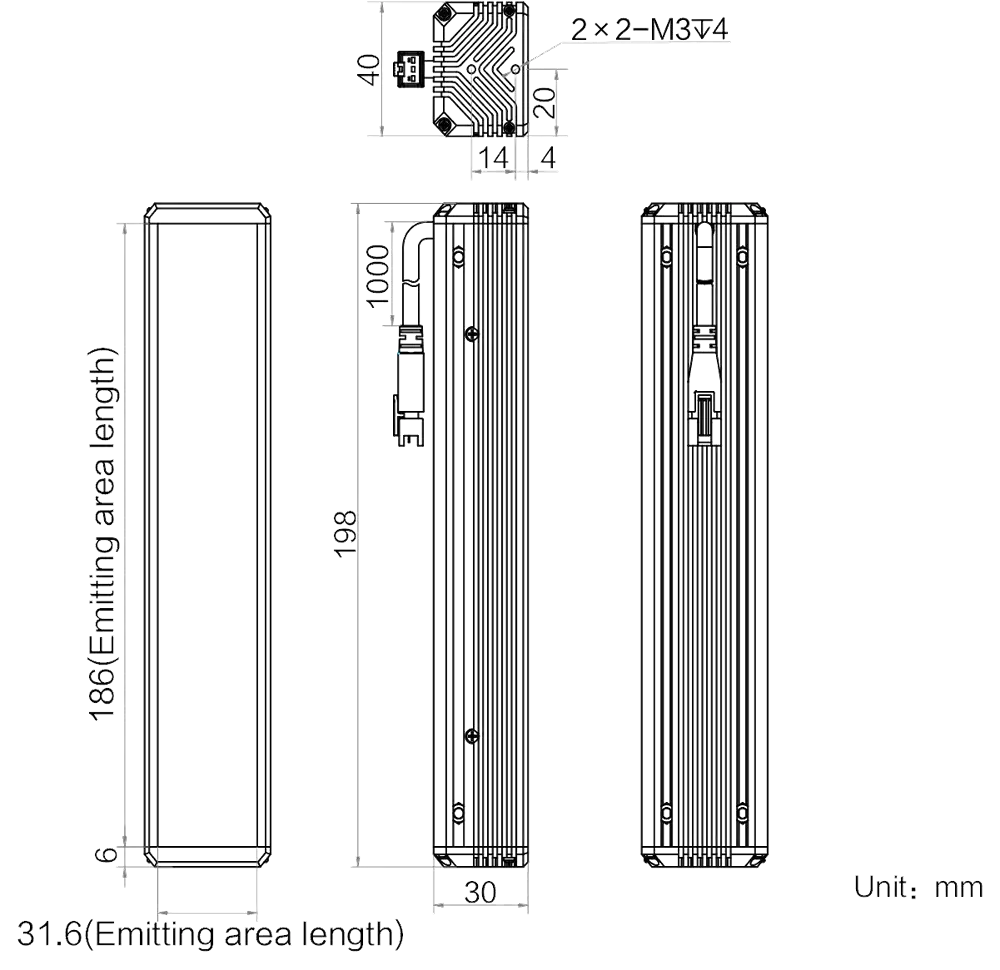Mechanische Spezifikationen des MV-LLDS-H-200-40-R: Abmessungen: 198 mm × 40 mm × 30 mm | Abstrahlflächenabmessungen: 186 mm × 31.6 mm | LED-Reihen: 6 | Gewicht: 0.41 kg. Diffusionsplatte (PMMA) inklusive für gleichmäßigere Lichtverteilung. Die 6-reihige LED-Anordnung sorgt für besonders hohe und gleichmäßige Leuchtdichte über das gesamte Abstrahlfeld.