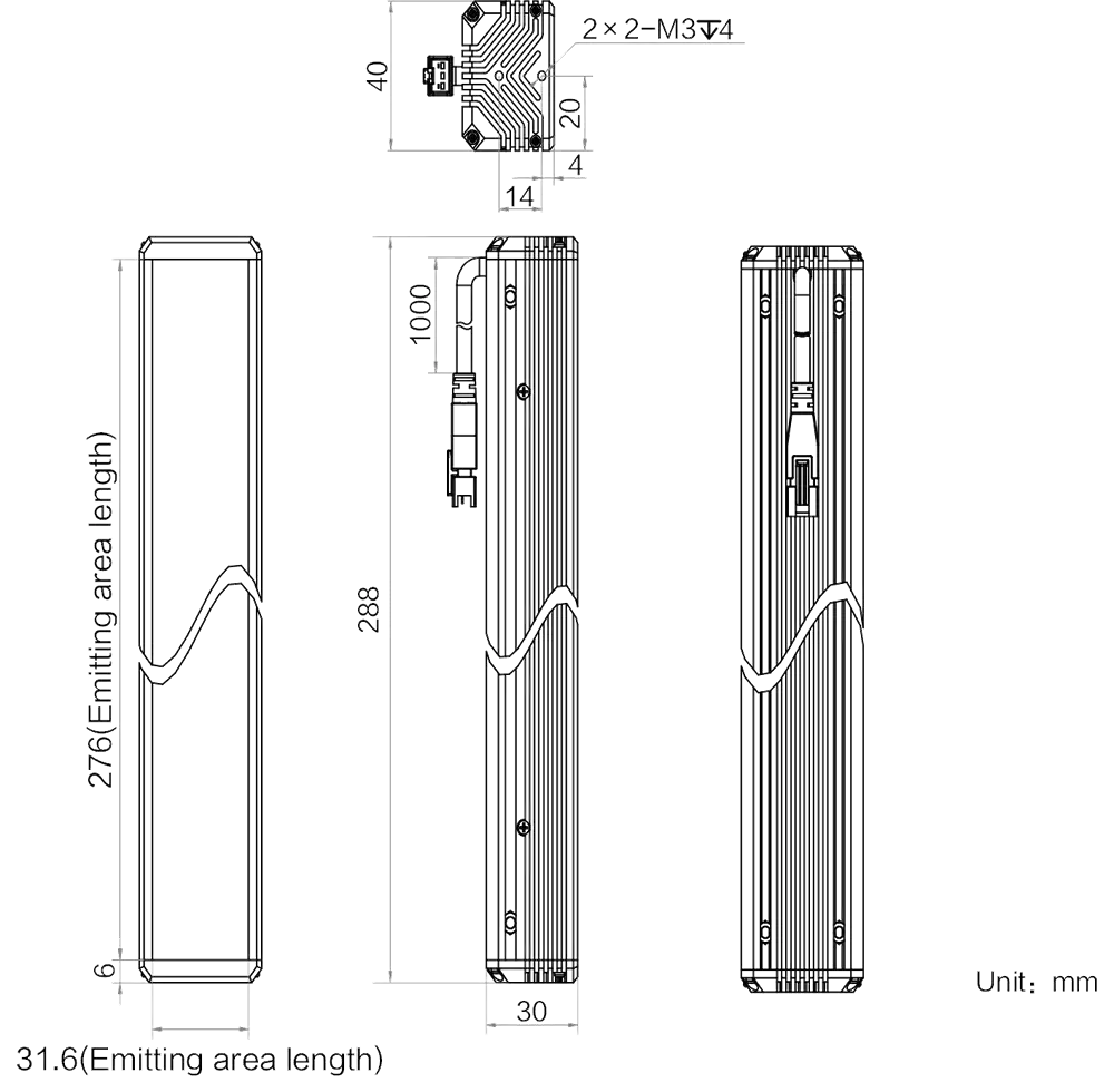 Mechanische Spezifikationen des MV-LLDS-H-300-40-R: Abmessungen: 288 mm × 40 mm × 30 mm | Abstrahlflächenabmessungen: 276 mm × 31.6 mm | LED-Reihen: 6 | Gewicht: 0.57 kg. Diffusionsplatte (PMMA) inklusive für gleichmäßigere Lichtverteilung. Die 6-reihige LED-Anordnung sorgt für besonders hohe und gleichmäßige Leuchtdichte über das gesamte Abstrahlfeld.