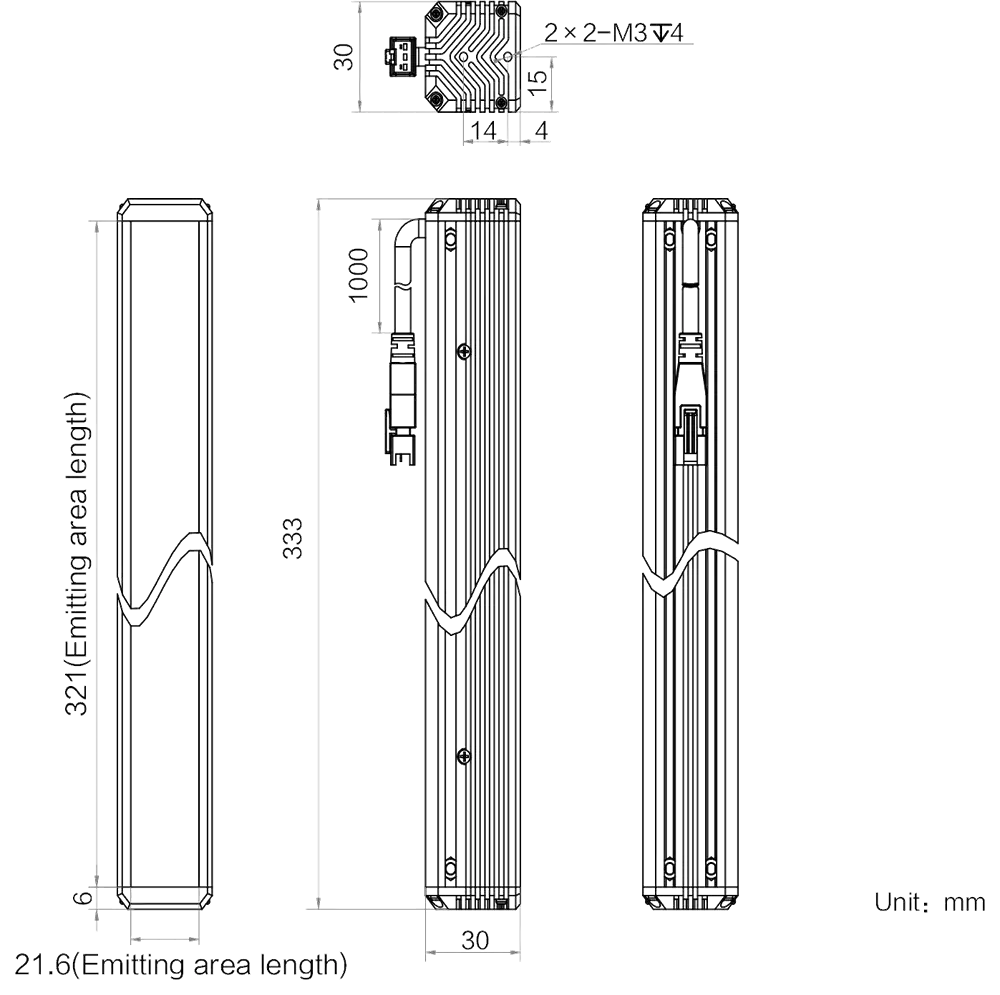 Mechanische Spezifikationen des MV-LLDS-H-350-30-IR850: Abmessungen: 333 mm × 30 mm × 30 mm | Abstrahlflächenabmessungen: 321 mm × 21.6 mm | LED-Reihen: 4 | Gewicht: 0.59 kg. Diffusionsplatte (PMMA) inklusive für gleichmäßigere Lichtverteilung. Die 4-reihige LED-Anordnung sorgt für besonders hohe und gleichmäßige Leuchtdichte über das gesamte Abstrahlfeld.