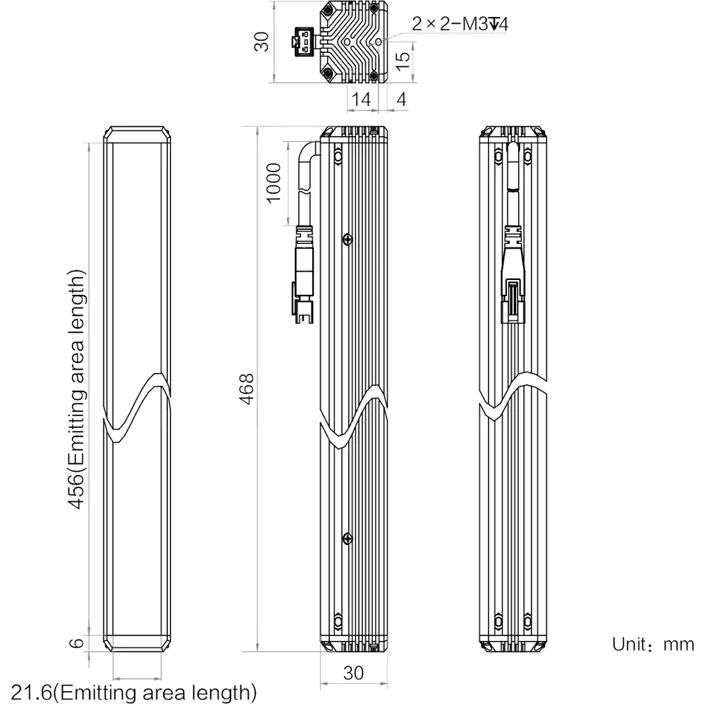 Mechanische Spezifikationen des MV-LLDS-H-500-30-W: Abmessungen: 468 mm × 30 mm × 30 mm | Abstrahlflächenabmessungen: 456 mm × 21.6 mm | LED-Reihen: 4 | Gewicht: 0.83 kg. Diffusionsplatte (PMMA) inklusive für gleichmäßigere Lichtverteilung. Die 4-reihige LED-Anordnung sorgt für besonders hohe und gleichmäßige Leuchtdichte über das gesamte Abstrahlfeld.