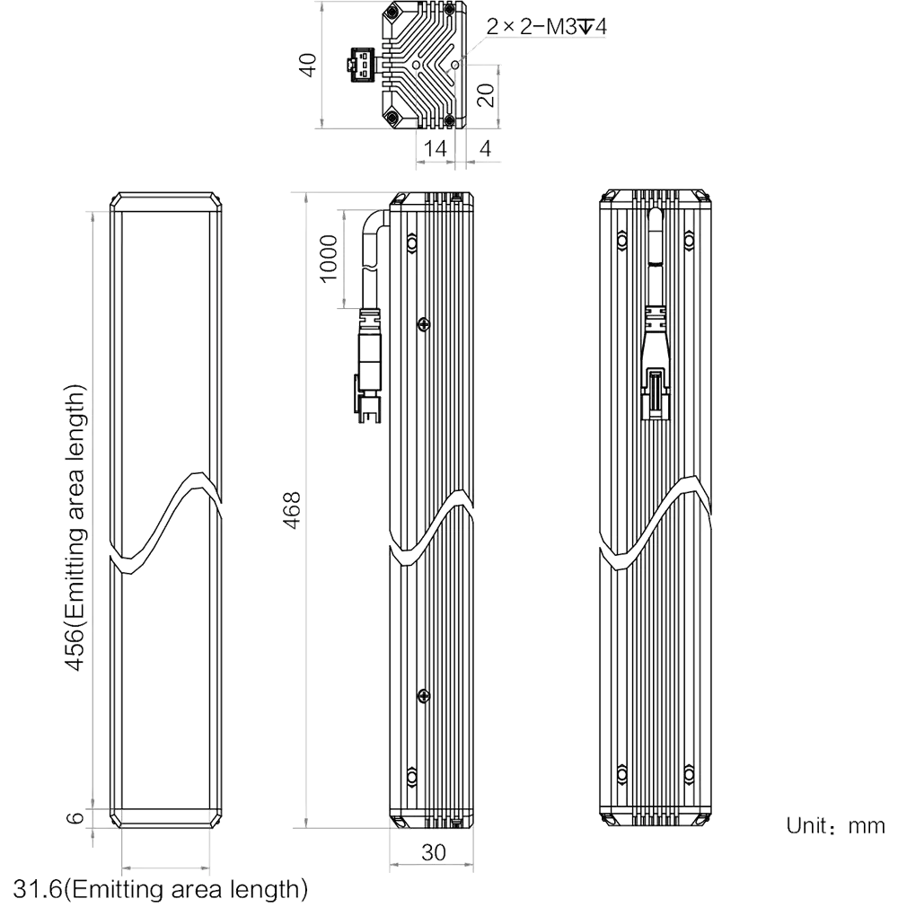 Mechanische Spezifikationen des MV-LLDS-H-500-40-W: Abmessungen: 468 mm × 40 mm × 30 mm | Abstrahlflächenabmessungen: 456 mm × 31.6 mm | LED-Reihen: 6 | Gewicht: 0.91 kg. Diffusionsplatte (PMMA) inklusive für gleichmäßigere Lichtverteilung. Die 6-reihige LED-Anordnung sorgt für besonders hohe und gleichmäßige Leuchtdichte über das gesamte Abstrahlfeld.