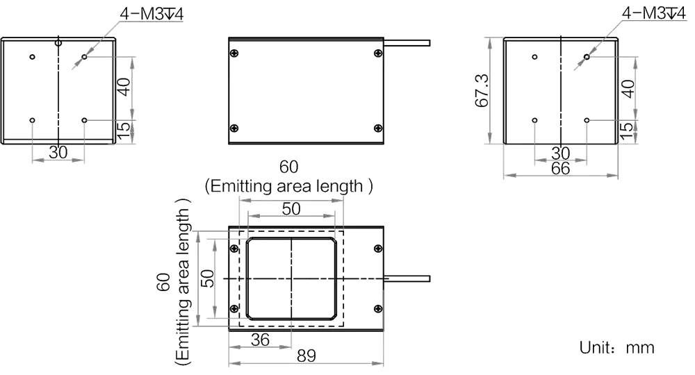 Mechanische Spezifikationen des MV-LCDS-H-60-60-B: Abmessungen: 89 mm × 67.3 mm × 66 mm | Abstrahlflächenabmessungen: 60 mm × 60 mm | Gewicht: 320 g. Diffusionsplatte (Included) inklusive für gleichmäßigere Lichtverteilung.