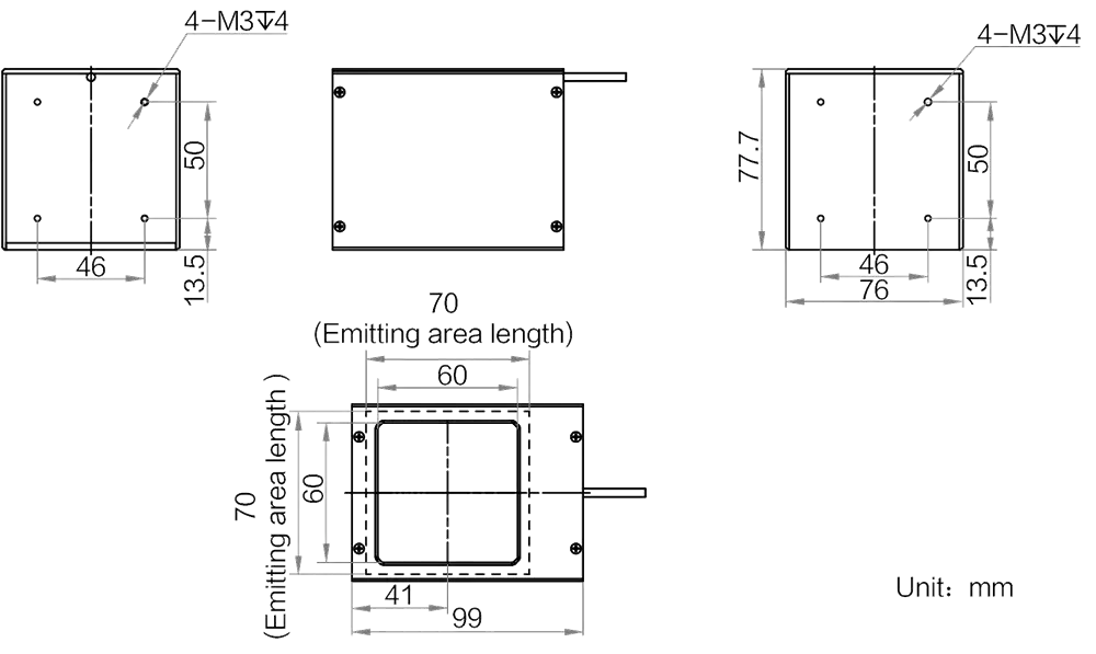 Mechanische Spezifikationen des MV-LCDS-H-70-70-W: Abmessungen: 99 mm × 77.7 mm × 76 mm | Abstrahlflächenabmessungen: 70 mm × 70 mm | Gewicht: 417 g. Diffusionsplatte (Included) inklusive für gleichmäßigere Lichtverteilung.