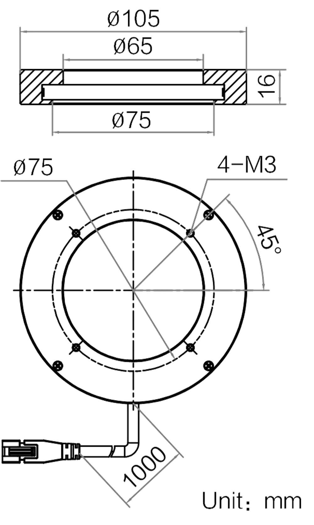 Mechanische Spezifikationen des MV-LRDS-H-105-0-R2: Abmessungen: Φ105 mm × 16 mm | Außenmaße: Φ105 mm | Bohrungsdurchmesser: Φ65 mm | Abstrahlflächenabmessungen: Φ75 mm | LED-Reihen: 1 | Gewicht: 190 g. Diffusionsplatte (PMMA) inklusive für gleichmäßigere Lichtverteilung.