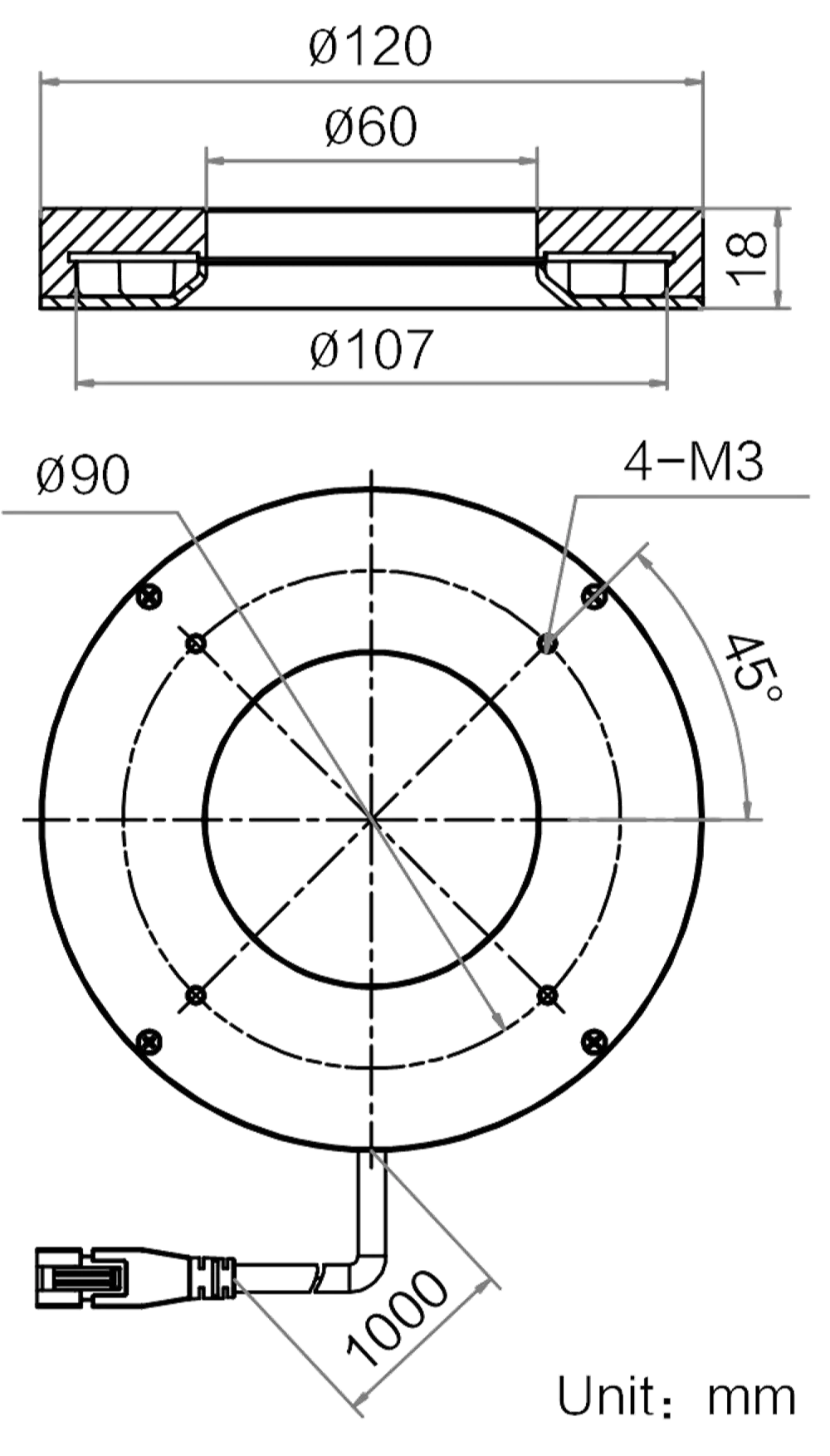 Mechanische Spezifikationen des MV-LRDS-H-120-30-W2: Abmessungen: Φ120 mm × 18 mm | Außenmaße: Φ120 mm | Bohrungsdurchmesser: Φ60 mm | Abstrahlflächenabmessungen: Φ107 mm | LED-Reihen: 2 | Gewicht: 285 g. Diffusionsplatte (PMMA) inklusive für gleichmäßigere Lichtverteilung. Die 2-reihige LED-Anordnung sorgt für besonders hohe und gleichmäßige Leuchtdichte über das gesamte Abstrahlfeld.