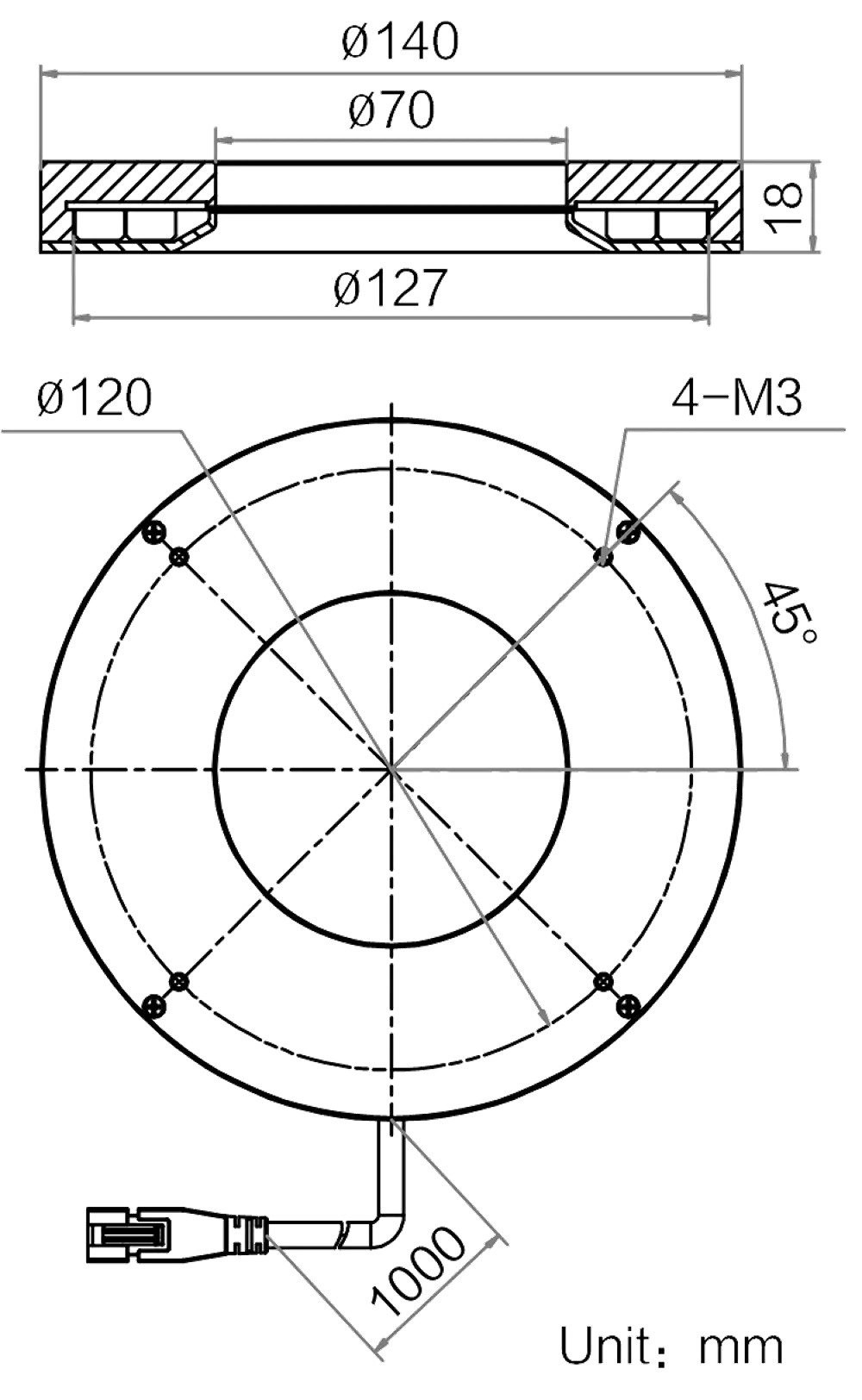 Mechanische Spezifikationen des MV-LRDS-H-140-15-B2: Abmessungen: Φ140 mm × 18 mm | Außenmaße: Φ140 mm | Bohrungsdurchmesser: Φ70 mm | Abstrahlflächenabmessungen: Φ127 mm | LED-Reihen: 2 | Gewicht: 380 g. Diffusionsplatte (PMMA) inklusive für gleichmäßigere Lichtverteilung. Die 2-reihige LED-Anordnung sorgt für besonders hohe und gleichmäßige Leuchtdichte über das gesamte Abstrahlfeld.