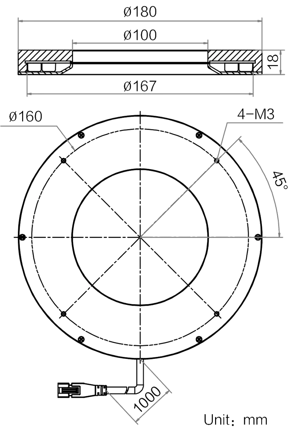 Mechanische Spezifikationen des MV-LRDS-H-180-60-W2: Abmessungen: Φ180 mm × 18 mm | Außenmaße: Φ180 mm | Bohrungsdurchmesser: Φ100 mm | Abstrahlflächenabmessungen: Φ167 mm | LED-Reihen: 2 | Gewicht: 570 g. Diffusionsplatte (PMMA) inklusive für gleichmäßigere Lichtverteilung. Die 2-reihige LED-Anordnung sorgt für besonders hohe und gleichmäßige Leuchtdichte über das gesamte Abstrahlfeld.