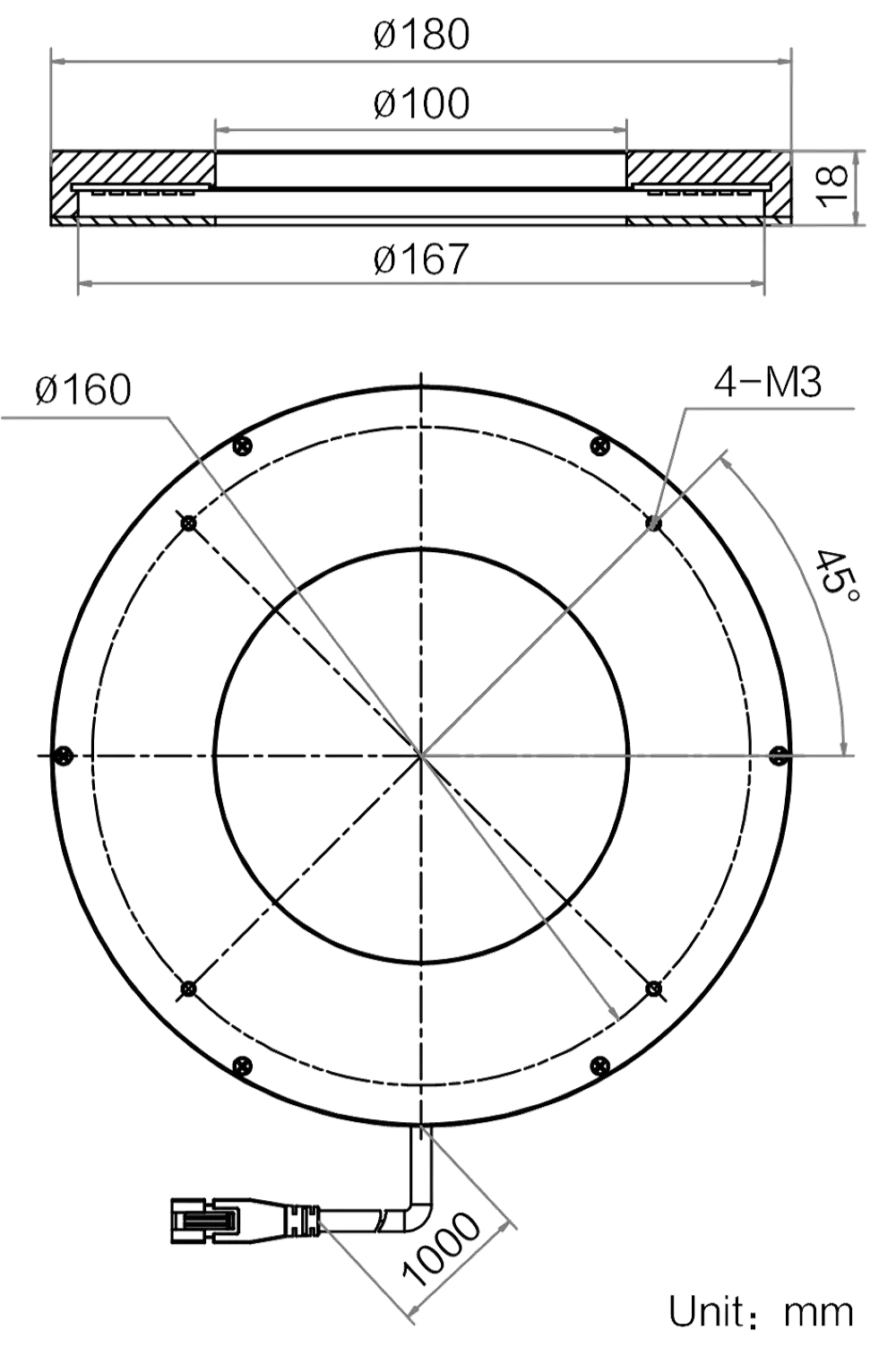Mechanische Spezifikationen des MV-LRDS-H-180-90-R2: Abmessungen: Φ180 mm × 18 mm | Außenmaße: Φ180 mm | Bohrungsdurchmesser: Φ100 mm | Abstrahlflächenabmessungen: Φ167 mm | LED-Reihen: 6 | Gewicht: 550 g. Diffusionsplatte (PMMA) inklusive für gleichmäßigere Lichtverteilung. Die 6-reihige LED-Anordnung sorgt für besonders hohe und gleichmäßige Leuchtdichte über das gesamte Abstrahlfeld.