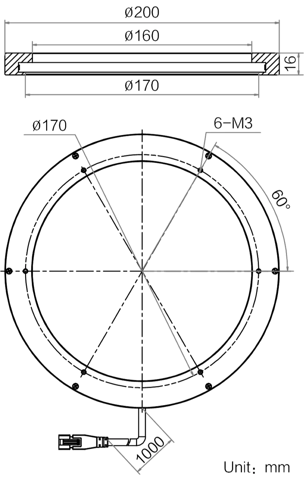 Mechanische Spezifikationen des MV-LRDS-H-200-0-W2: Abmessungen: Φ200 mm × 16 mm | Außenmaße: Φ200 mm | Bohrungsdurchmesser: Φ160 mm | Abstrahlflächenabmessungen: Φ170 mm | LED-Reihen: 1 | Gewicht: 370 g. Diffusionsplatte (PMMA) inklusive für gleichmäßigere Lichtverteilung.
