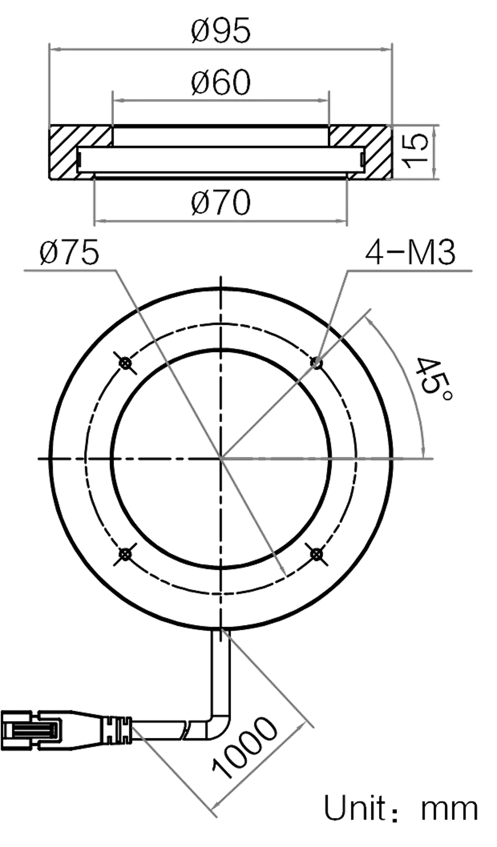 Mechanische Spezifikationen des MV-LRDS-H-95-0-B2: Abmessungen: Φ95 mm × 15 mm | Außenmaße: Φ95 mm | Bohrungsdurchmesser: Φ60 mm | Abstrahlflächenabmessungen: Φ70 mm | LED-Reihen: 1 | Gewicht: 140 g. Diffusionsplatte (PMMA) inklusive für gleichmäßigere Lichtverteilung.