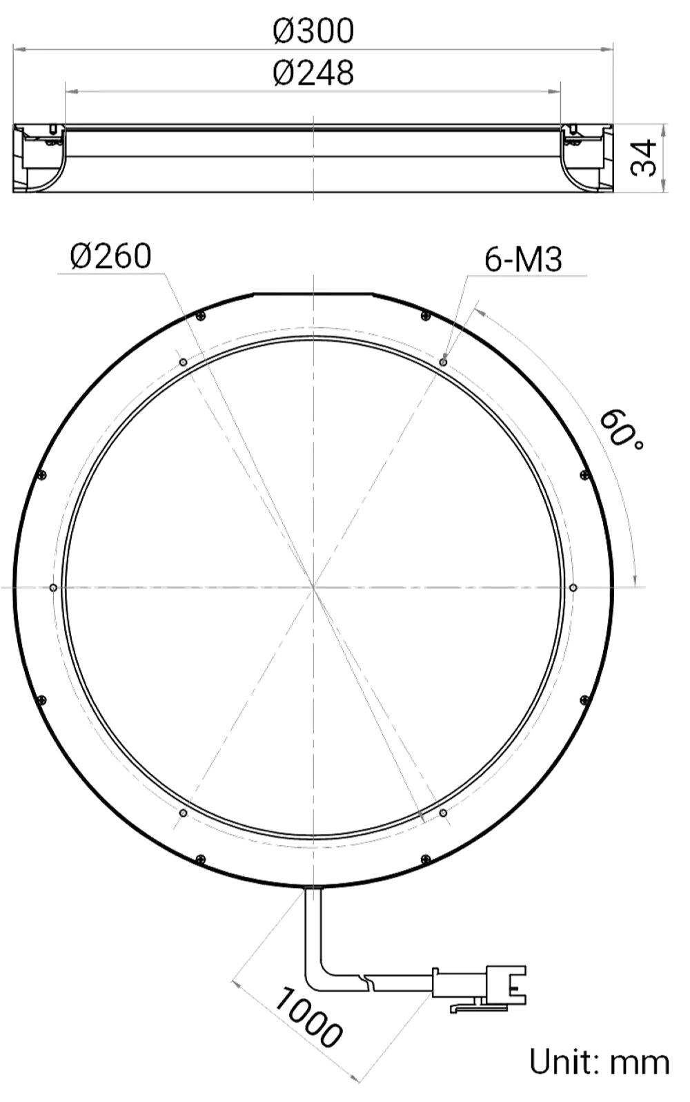 Mechanische Spezifikationen des MV-LRSS-H-300-W: Abmessungen: Φ300 mm × 34 mm | Bohrungsdurchmesser: Φ248 mm | Abstrahlflächenabmessungen: Φ286 mm | LED-Reihen: 1 | Gewicht: 870 g. Diffusionsplatte (PMMA) inklusive für gleichmäßigere Lichtverteilung.