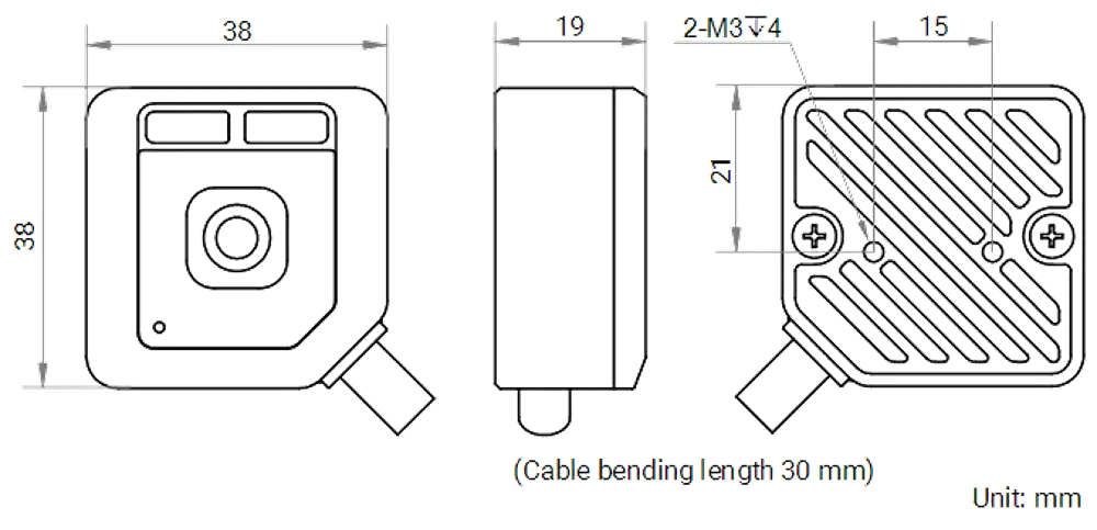 Das schlanke Profil von 38 × 38 × 19 mm, ca. 40 g Gewicht und IP54-Schutz gewährleisten zuverlässigen Betrieb auch unter industriellen Bedingungen mit Staub, Spritzwasser und Temperaturschwankungen.
